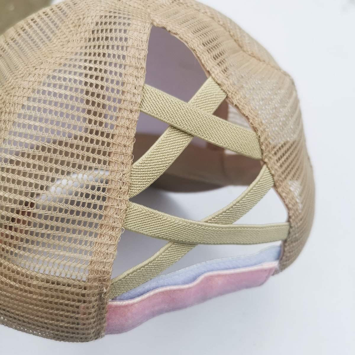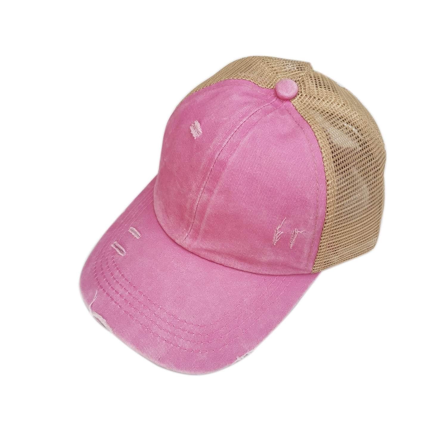 Perfect for young girls. This listing if for a distressed Pink hat with tan mesh back and tan elastic.