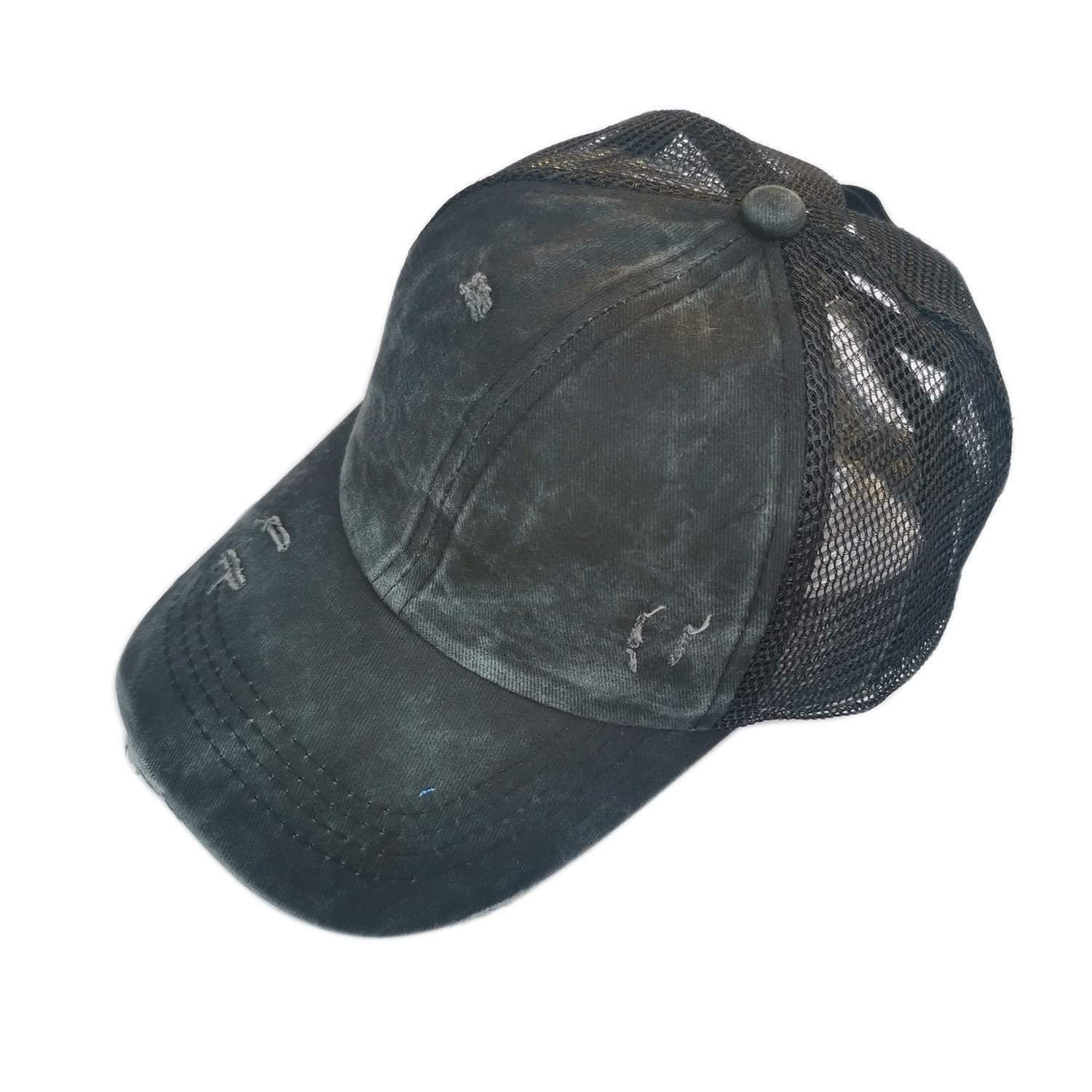Perfect size for young girls. This listing if for a distressed black hat with black mesh back and black elastic.